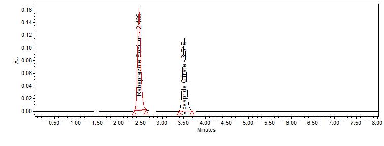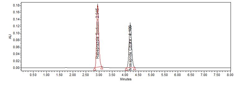 By applying the proposed method, the retention times of rabeprazole and mosapride were observed at 2.946 and 4.186 minat 276 nm respectively. A typical chromatogram is represented in fig. no. 10.