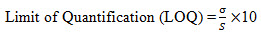 8. Limit of Quantification: It is defined as lowest concentration of analyte in a sample that can be determined with acceptable precision and accuracy and reliability by a given method under stated experimental conditions. LOQ is expressed as a concentration at a specified signal to noise ratio.