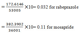 Conclusion:The proposed method was adequate sensitive, reproducible, and specific for the determination of rabeprazole and mosapride in bulk as well as in tablet dosage forms.