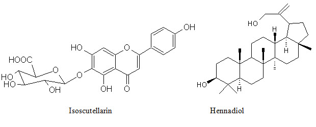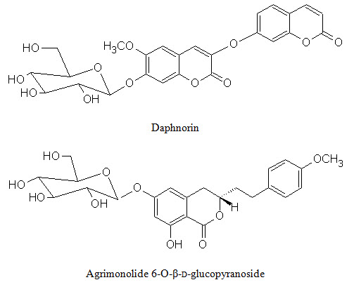 Phenolic conpounds Lawsoniaside (1,3,4-trihydroxynaphthalene 1,4-di-β-D-gluco-pyronoside), Lalioside (2,3,4,6-tetrahydroxyacetoxy-2-β-D-glucopyranoside) Lawsoniaside B (3-(4-O-a-D-glucopyranosyl-3,5-dimethoxy) phenyl-2E-propenol), syringinoside, daphneside, daphnorin, agrimonolide 6-O-β-D-glucopyranoside, (+)-syringaresinol O-β-D-glucopyranoside, (+)-pinoresinol di-O-β-D-glucopyranoside, syringaresinol di-O-β-D-glucopyranoside, isoscutellarin |