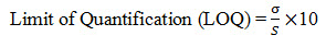 8. Limit of Quantification: It is defined as lowest concentration of analyte in a sample that can be determined with acceptable precision and accuracy and reliability by a given method under stated experimental conditions. LOQ is expressed as a concentration at a specified signal to noise ratio.
