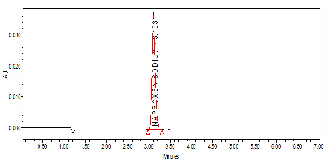 By applying the proposed method, the retention time of Naproxen was observed at 3.063 min at 210 nm. Quantitative linearity was obeyed in the concentration ranges of 20-80 µg/mL for Naproxen. The relevant regression equation was y = 86.83x + 57.31