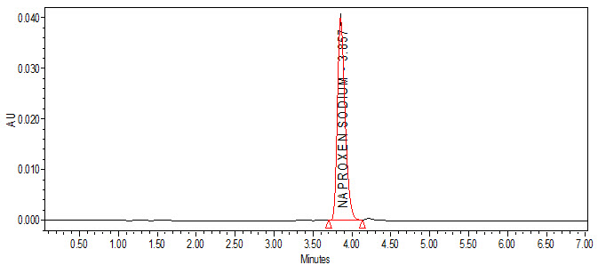 System Suitability: The tailing factor for the peaks due to Naproxen in Standard solution should not be more than 2.0. The Theoretical plates for Naproxen peaks in Standard solution should not be less than 2000. The system suitability of the method was checked by injecting five different preparations of Naproxen. The parameters of system suitability were checked.