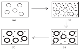 Figure-2 schematic representation of the coacervation process. (A) core material dispersion in solution of polymer shell; (B) separation of coacervate from solution; (c)coating of core material by micro droplet of coacervate (D) coalescence of coacervate to form continuous shell around core particle.
