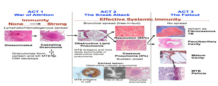1. Act II Post-primary bronchogenic TB begins asymptomatically in the apices of the lung, at some distance from the site initial infection