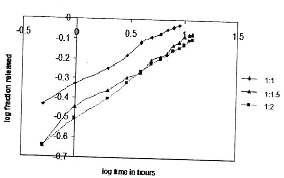 (Koresenmeyer-peppas plot for span 80 prepared salbutamol sulphate microspheres(1%) with different drug to polymer ratios)