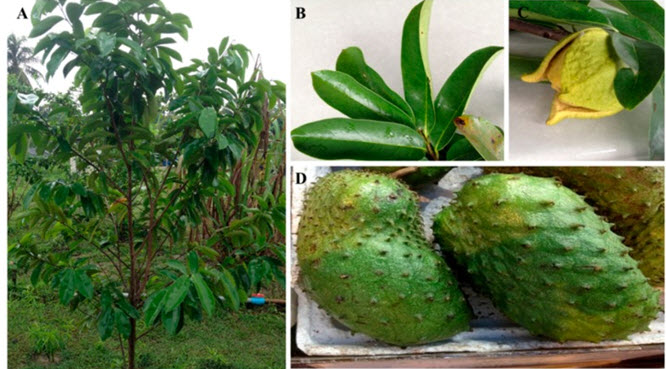 A. muricata L., commonly known as soursop, graviola, guanabana, paw-paw and sirsak, is a member of the Annonaceae family comprising approximately 130 genera and 2300 species3,4. A. muricata is native to the warmest tropical areas in South and North America and is now widely distributed throughout tropical and subtropical parts of the world, including India, Malaysia and Nigeria5. A. muricata is an evergreen, terrestrial, erect tree reaching 5–8 m in height and features an open, roundish canopy with large, glossy, dark green leaves. The edible fruits of the tree are large, heart-shaped and green in color, and the diameter varies between 15 and 20 cm (Figure 1)6.