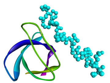 Figure 2. Ribbon diagram of the SH2 domain from p56lck (green ribbons) bound to phosphopeptide (spacefilled cyan) (PDB: 1CWE).