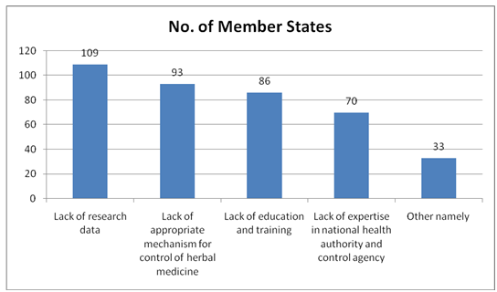 The countries were asked about their specific needs and given the opportunity to provide feedback on the types of support they most needed from WHO. The first question was asked about the main difficulties faced by each Member State regarding regulatory issues for herbal medicines. The options, the countries could select as their answer, included the following: lack of research data, lack of expertise within the national health authorities and drug control agency, lack of appropriate mechanisms for control of herbal medicines, lack of education and training.