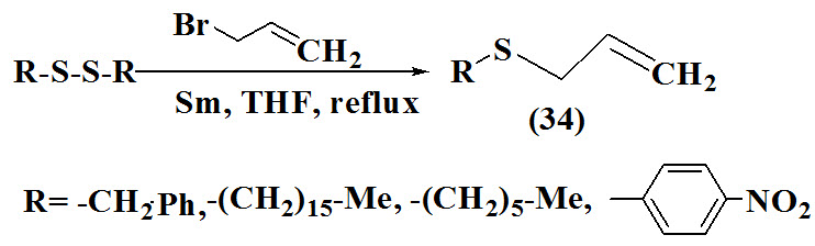Mingxin and Zhang, 1997 reported a convenient procedure for allyl sulfides (34) which involve treatment of alkyl or aryl disulfides in the presence of samarium as a catalyst with allyl bromide in THF lead to product in good yield.