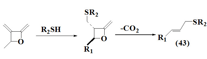 Another interesting method allyl sulfides (43) reported by Nava-Salgado et al; 1995 involve extrusion of CO2 from the intermediate (substituted ß- lactone) with retained stereochemistry as reactant resulted into main product.