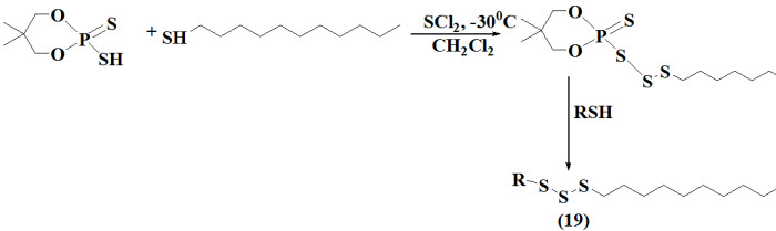et al., 2010 reported synthesis of unsymmetrical trisulfides (19) followed by treatment of SCl2 with mixture of dodecane-1-thiol and 5,5-dimethyl-2-sulfanyl-2-thioxo-1,3,2-dioxaphosphorinane at 30°C and resulting intermediate 1-[(5,5-dimethyl-2-thioxo-1,3,2-dioxaphosphorinan-2-yl)-trisulfanyl]dodecane11-sulfanylundecanol. The intermediate further afforded a complex mixture of product such as unsymmetrical and symmetrical trisulfides on treatment with Et3N.