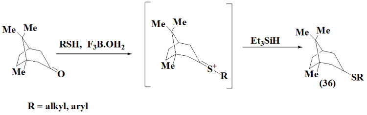 Archer et al., 1994 reported synthesis of sulfide (36) from camphor by treatment of camphor with a thiol agent in the presence of a lewis acid (F3B.OH2) result into formation of thionium ion as a intermediate further reacted with Et3SiH to form chiral sulfides.