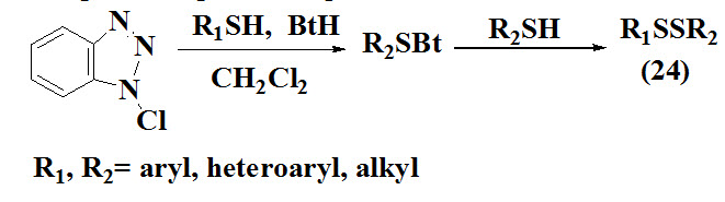 The one step formation of unsymmetrical disulfides (24) reported by Hunter et al., 2006 which involved oxidation of 1-chlorobenzotriazole (BtCl) in the presence of CH2Cl2 at -78ºC and different thiols agents. The products were obtained in moderate yield. The product was analysed by various spectroscopic techniques.