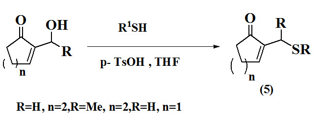 Oueslati et al., 2016 reported a direct route for synthesis of allyl sulfides (5) using cyclic p-TsOH-mediated followed by the direct α-substitution of cyclic Morita–Baylis–Hillman alcohols with aliphatic and aromatic thiols in refluxing THF. The reaction proceeded with complete α-regioselectivity and provided the corresponding allyl sulfides in moderate to good yields.