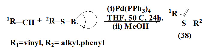 Backvall et al., 1994 synthesized vinyl sulfides (38) via palladium catalysed thioboration of alkynes with 9-(alkylthio)-BBN. The products were obtained in good yield