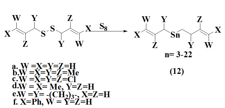 Wang et al., 2013 synthesized diallyl polysulfanes (12) by treatment of diallyl disulfide and liquid sulphur at 120ºC resulted into families of polysulfanes with up to 22 sequential sulphur atoms. The resulted product characterized by ultra-performance liquid chromatography and obtained in good yield.