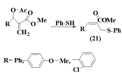 Das et al., 2007 reported synthesis of (Z)- and (E)-allyl sulfides (21) using Morita-Baylis-Hillman Acetates. The product obtained in good yield and characterized by various spectrometric techniques. The reaction occurs at room temperature and without presence of any catalyst.