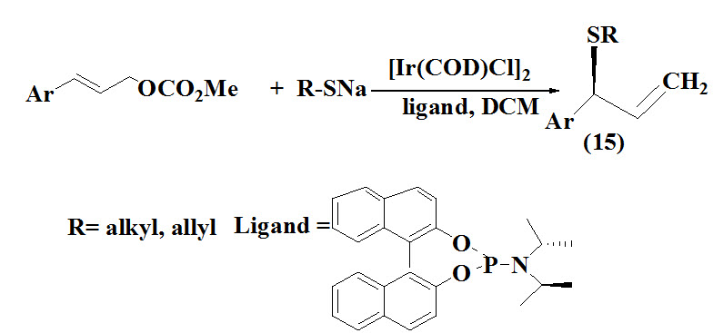 Gao et al., 2011 reported an iridium-catalyzed regio-and enatioselective synthesis of allyl sulfides (15) via allylation of allyl carbonates with aliphatic thiols as the nucleophile in dichloromethane enables the regioselective synthesis of branched allyl sulfides in good yields and high enantioselectivity.