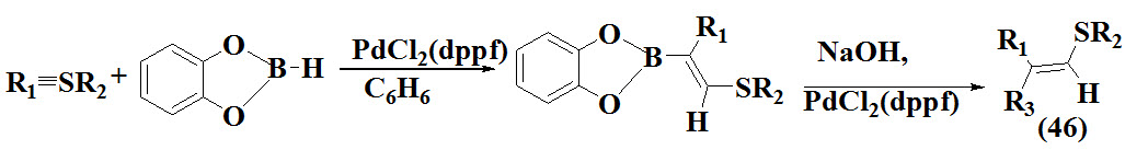 Gridnev et al., 1993 reported one pot method for synthesis of vinyl sulfides (46) using thioalkynes via cataltytic hydroboration.The synthetic procedure involve reaction of a thioalkyne in presence of Pd0 with catechol borane resulting into main product.