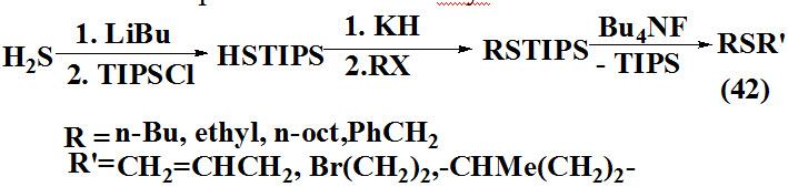 Miranda et al., 1994 reported synthesis of unsymmetrical sulfides (42) using a new reagent trisopropylsilanethiol (TIPS) which formed by conversion of H2S to triisopropylsilyl (HSTIPS) further treated with potassium salt and akyl halide