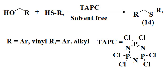 Bahrami et al., 2011 proposed efficient synthesis of allyl sulfides (14) using TAPC as catalyst by reaction of benzylic alcohols with aryl, heteroaryl, and alkyl thiols under metal-free and solvent-free conditions. The products were obtained in good yield and were characterized by spectrometric techniques.