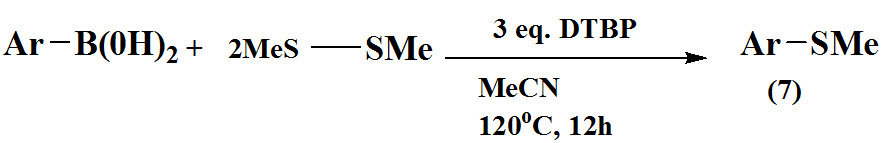 Wu et al., 2016 reported an efficient pathway for synthesis of aryl methyl sulfides (7) via coupling of arylboronic acids with dimethyl disulfide under metal-free conditions.