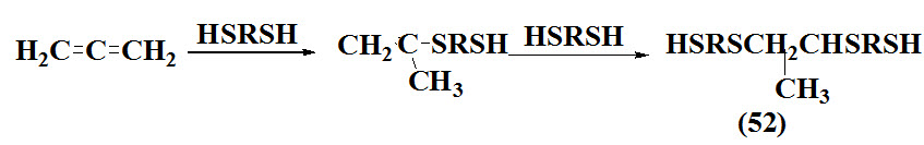 Oswald et al., 1968 synthesized allyl sulfides (52) via addition of dithiols to allene involved free radical mechanism lead to polymer formation. The polyadditions were usually followed by nuclear magnetic resonance (NMR) spectroscopy of samples from the reaction mixtures. The crude liquid products were stripped with nitrogen bubbling at 1350C. under a pressure of about 0.3 mm. to remove all the volatile starting materials and impurities. The solid polyadducts were purified by fractional reprecipitation with a benzene-methanol solvent-precipitant pair.