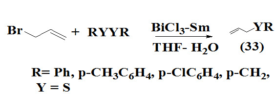 Zhan et al., 1999 reported a novel synthesis of allyl sulfides (33) via. Sm-BiCl3 system in aqueous media. The best yield were obtained under nitrogen atmosphere. The result indicated that Sm-BiCl3 system facilitates the cleavage of S-S bond which was considered one of the major advantage of this method. The products were characterized by various spectroscopic techniques.