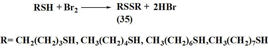 A new synthetic route for synthesis of disulfides (35) reported by Wu et al., 1996. The reaction was carried out between thiols and bromine which act as a oxidizing agent without use of any solvent. The reaction conditions were mild and the yields were essentially quantitative.