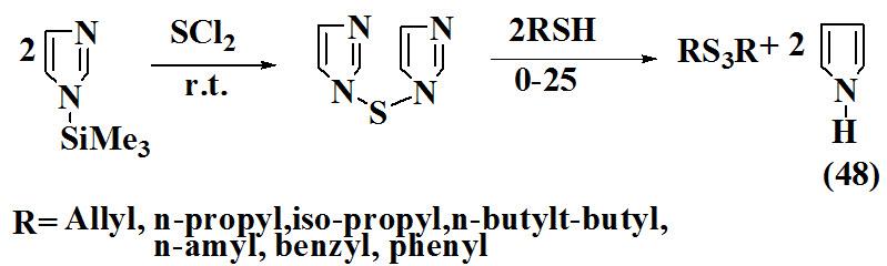 Banerji and Kalena, 1980 synthesized organic trisulfides (48) with addition of hexane solution of n-trimethylailylimidazole with sulfur dichloride in hexane under dry conditions followed by addition of freshly distilled allyl thiol.