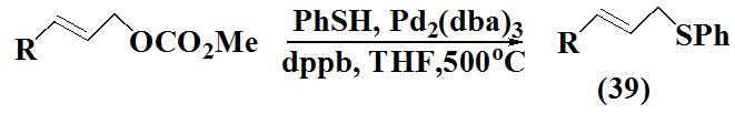 Goux et al., 1994 reported synthesis of allyl, homoallyl sulfides (39) by approaching various methods. The allylation reaction of thiols using carbonated and aromatic thiols in the presence of Pd0 gives moderate to excellent yield of allyl and cinnamyl aryl sulfides.