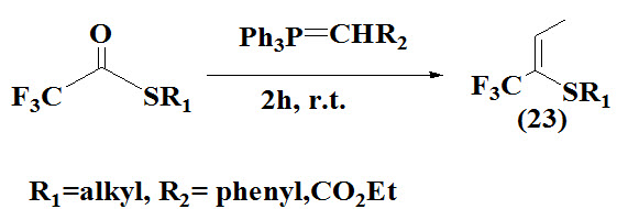 Begue et al., 1996 prepared Trifluromethyl vinyl sulfides (23) by witing reaction on thiotrifluoroacetates.