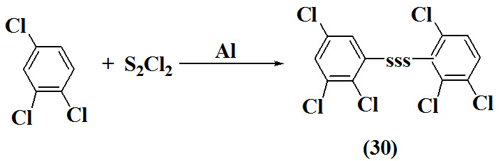 Ayodele et al., 1999 synthesized aryl trisulfides (30) by treatment of 1,2,4-trichlorobenzene with sulfur monochloride and aluminurn gives the S,S'-trisulfide..
