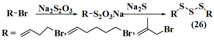 Ren et al., 2009 reported synthesis of 1,3-Diallyltrisulfane (26) by carried out reaction between sodium thiosulfate and unsaturated alkyl bromide at 500-600C with continuous stirring followed by addition of sodium sulfide solution. The product obtained in good yield.