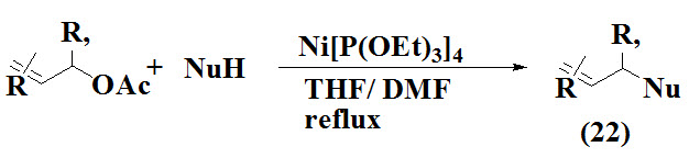 Yatusmonji et al., 2007 synthesized allylic sulfides (22) by treatment of allylic acetates with thiols in the presence of nickel (0) triethyl phosphite complex with retention of configuration without allylic rearrangement.