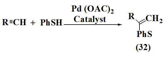 Ogawa et al., 1999 studied stereocontrolled and region formation of vinyl sulfides (32) via reaction of thiols with alkynes using transition-metal-Catalysis at 25°C. After the reaction was complete the solvent was removed in vacuo. Purification was done by a recycling preparative HPLC.