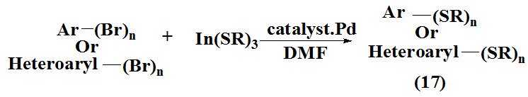 Lee et al., 2011 reported cross-coupling reactions between carbon and sulfur with indium tri(organothiolates) to synthesis di-, tri- and tetrasulfides (17) in a one-pot procedure which involve reaction of indium tri(organothiolates) with polybromonated aromatic and hetero aromatic compounds.