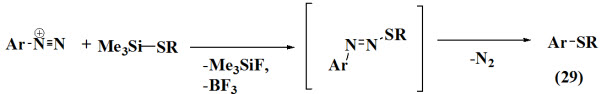 Prakash et al., 2002 reported synthesis of aryl phenyl sulfides (29) and aryl methyl from arenediazonium tetrafluoroborates and trimethyl(methylthio)-and trimethyl(phenylthio)silanes. A solution of trimethyl(phenylthio)-silane in dimethylformamide was added drop wise over 20 min to a solution of the corresponding diazonium tetrafluoroborate salt in DMF at –10°C (ice/salt mixture bath).