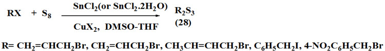 Sinha et al., 2003 synthesized diorganotrisulfides (28) by carried out reaction of organic halide and elemental sulfur using catalytic copper (II) halide and Tin (II) chloride in the solution of DMSO and THF at 30-70ºC.