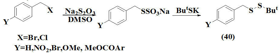 Hiver et al., 1994 proposed synthesis of unsymmetrical benzylic disulfides (40) from benzylic bromides and chlorides derived bunate salts. The reaction involve chemical treatment of thiosulfinate in DMSO subsequently followed by addition of thiolate to generate unsymmetrical disulfide.