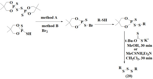 Kertmen et al., 2009 proposed a novel and efficient method for synthesis of symmetrical trisulfides (20) with treatment of bis (5,5-dimethyl 2-thioxo-1,3,2-dioxaphosphorinan-2-yl) disulfide or 5,5-dimethyl-2-sulfanyl-2-thioxo-1,3,2-dioxaphosphorinane with bromine at 30 °C resulting into desirable products.