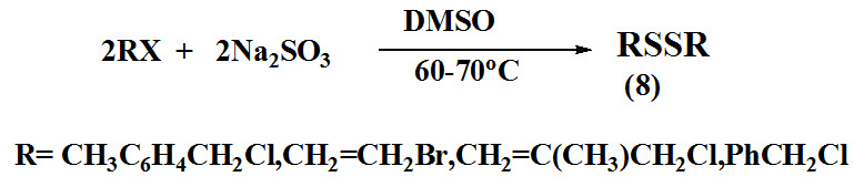 Abbasi et al., 2016 reported synthesis of symmetrical disulfides (8) by reacting organic halides and Na2SO3 in DMSO at 60-70ºC. The progress of the reaction checked by litmus paper, the color of litmus paper changed from yellow to red which indicated formation of product.