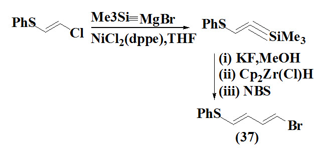 Babudri et al., 1998 synthesized vinyl aryl sulfides (37) using conjugated (E,E)-1-phenylthiobuta-1,3-dienes as a intermediate formed by treatment of trimethylsilylalkyne with Ni11- based cross coupling between Grignard reagents and 1-chloro-2-phenylthioethene. The intermediate undergo desilylation and treated with NBS (N-Bromosucinide) to give product.