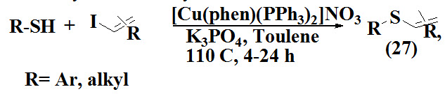 Bates et al., 2004 proposed a palladium-free approach for the synthesis of vinyl sulfides (27) in presence of copper(i) catalyst [cu(phen)(pph3)2]NO3, the desired product are observed with retention of stereochemistry in excellent yield.