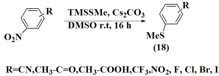 Qiao et al., 2011 proposed efficient synthesis of aryl methyl sulfide (18) by carried out methylthiolation using (methylthio)trimethylsilan. To a solution of 1-iodo-3,5-dinitrobenzene in DMSO was added Cs2CO3 and followed by stirring for 2 min. A dark purple solution obtained and TMSSMe was added.