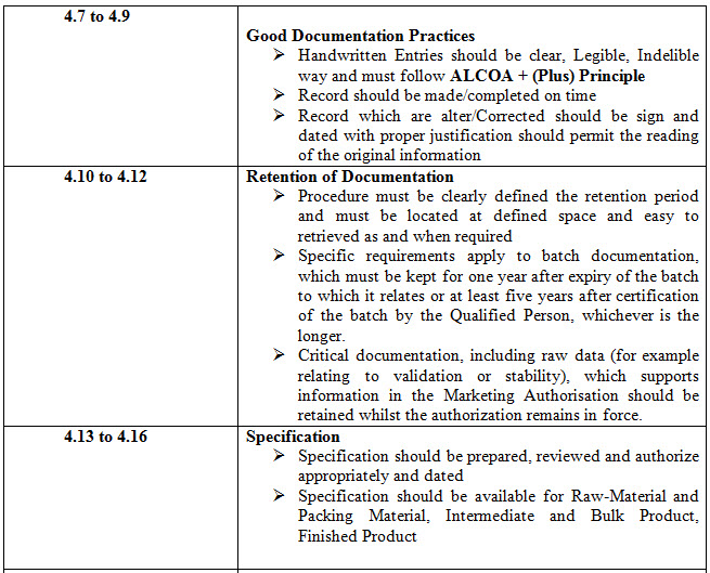 Good documentation constitutes an essential part of the quality assurance system and is key to operating in compliance with GMP requirements. Documentation requirements of maintaining complete, accurate, truthful and verifiable data in all cGXP documents that are needed to be maintained as per regulatory requirements and various Governmental regulations, laws, rules and statutes/acts. Documentation may exist in a variety of forms, including paper-based, electronic or photographic media. Ensure that the Document should be free from error and during any point if error identify then rectify with proper reason for correcting including sign and date. A system should be in place to indicate special observations and any changes to critical data. GMP Document must have predefined retention period and document must be stored in secure and easy to retrieve or easily available as and when required. Batch Processing and Packaging Instruction must be in place and Contemporaneous entry provision must be available. Instruction and procedure for using equipment; instrument must be clear and specific. Specification with authorization should be available for analysis of Raw Material and Packing Material, Intermediate and Bulk Product, Finished Product.
