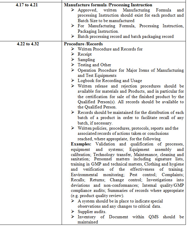 Batch Processing and Packaging Instruction must be in place and Contemporaneous entry provision must be available. Instruction and procedure for using equipment; instrument must be clear and specific. Specification with authorization should be available for analysis of Raw Material and Packing Material, Intermediate and Bulk Product, Finished Product.