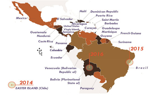 2013–2014: The virus causes outbreaks in four other groups of Pacific islands: French Polynesia, Easter Island, the Cook Islands, and New Caledonia. The outbreak in French Polynesia, generating thousands of suspected infections, is intensively investigated. The results of retrospective investigations are reported to WHO on 24 November 2015and 27 January 2016.