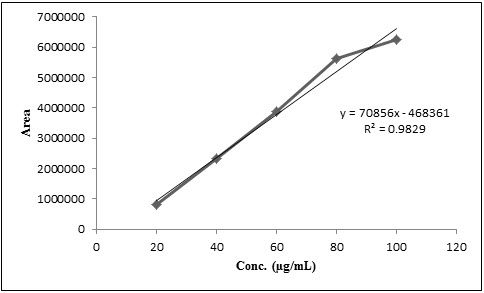 The calibration curve of Mebendazole was plotted using peak area vs. concentration and shown in Figure 3. The method has shown good linearity for Mebendazole (R2 = 0.9829) in the concentration range of 20-100 μg/mL.